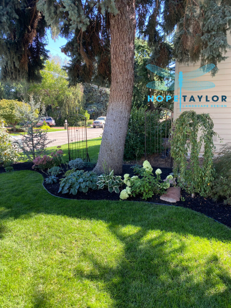 The heart of the garden’s shade palette comes from thoughtfully selected structural plants. A graceful Weeping Blue Atlas Cedar (Cedrus atlantica ‘Glauca Pendula’) adds movement and sculptural form, while the cascading habit of a Weeping Redbud (Cercis canadensis) and the delicate blooms of a Weeping Cherry (Prunus pendula) add seasonal magic. Hydrangeas fill the understory with lush texture—Hydrangea macrophylla (‘Big Leaf’), Hydrangea paniculata ‘Little Quick Fire’, and the durable Hydrangea serrata ‘Tuff Stuff’.