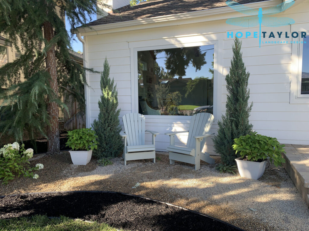 In the sitting area near the deck, we framed the wooden Adirondack-style chairs with textural evergreens and shade-loving companions. The upright elegance of Juniperus contrasts beautifully with the low, spreading speckled foliage of Pulmonaria, which softens the edges and adds gentle spring charm. Flanking the seating, two square pots showcase vibrant Hydrangea macrophylla in blue, bringing a cheerful pop of color and softness to the shady corner.