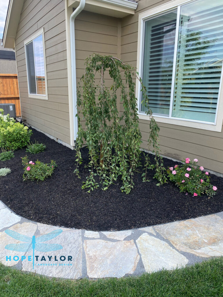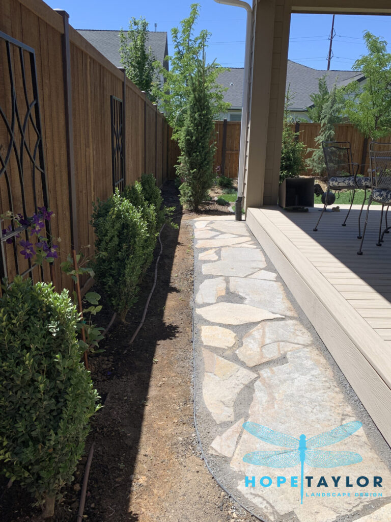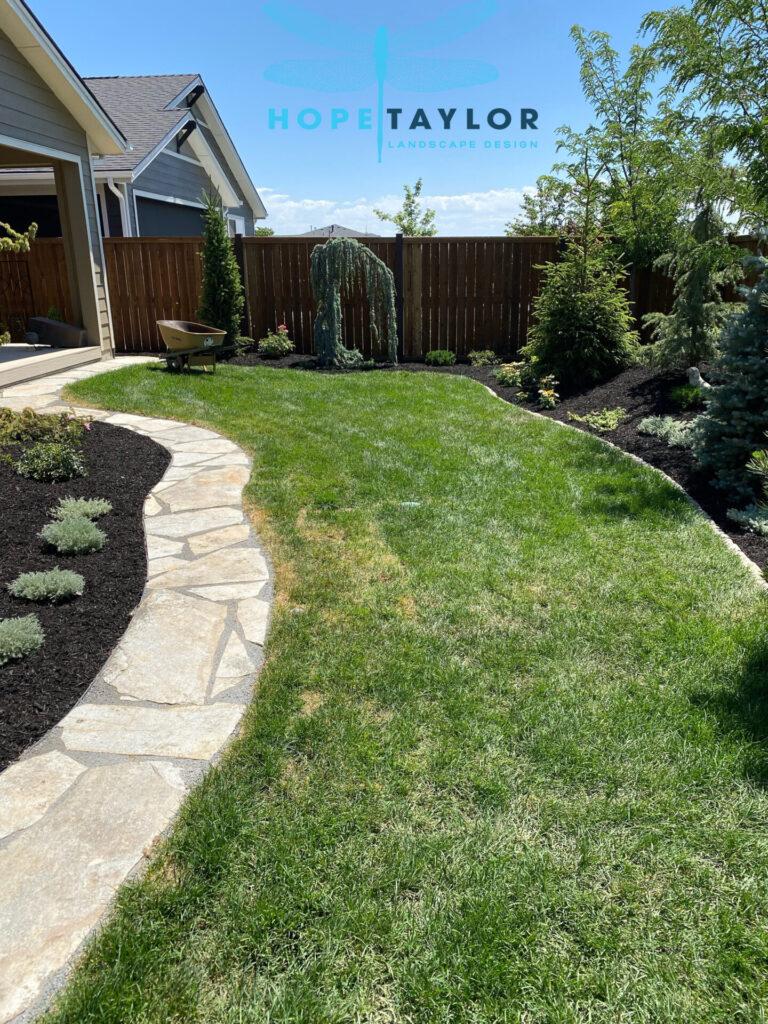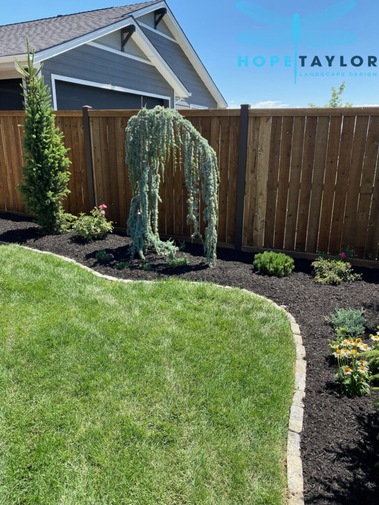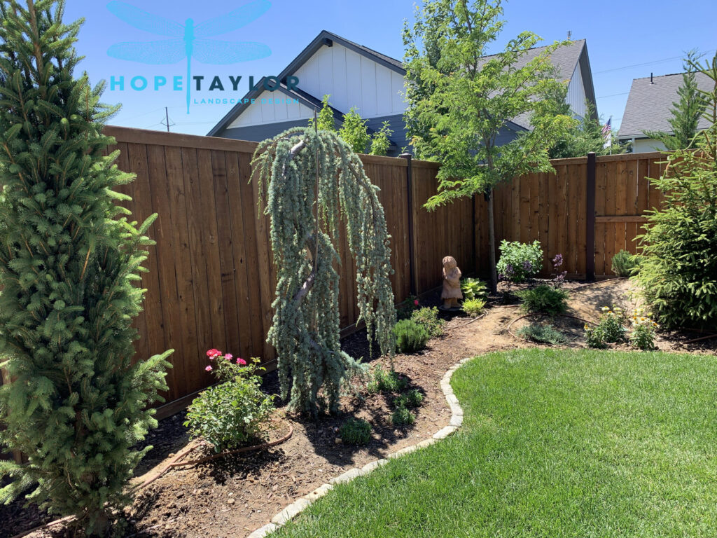 A winding flagstone path now leads guests on a curated journey through the garden, drawing the eye away from property lines and toward sweeping greenery. To achieve that elegant “estate garden” look, we’ve added stately evergreens like Dark Blue Angel Cedar Deodora, Columnar Norway Spruce, and the graceful Weeping Serbian Spruce, alongside existing Arborvitae, now thoughtfully relocated for balance.
